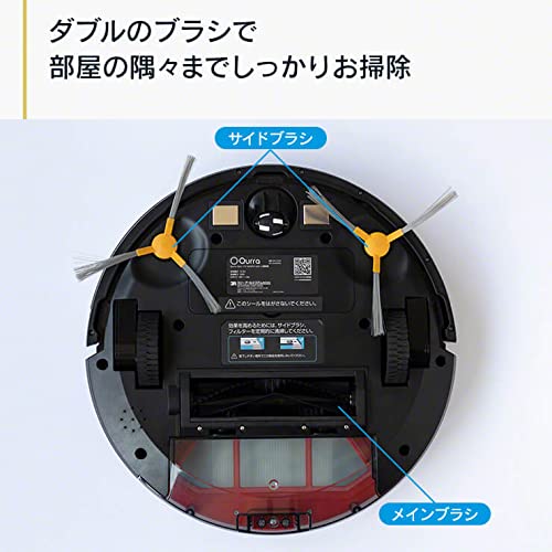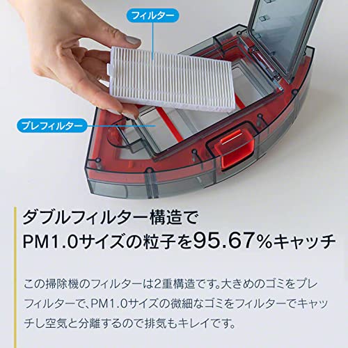 | 付属品 | :ACアダプタ×1、充電ドック×1、床拭き布×2、サイドブラシL×2、サイドブラシR×2、ダストボックス×1、水タンク×1、リモコン×1、リモコン用単4電池×2、お手入れ用ブラシ×1、フィルター×2 (1個は内蔵)、プレフィルター×1(内蔵) |