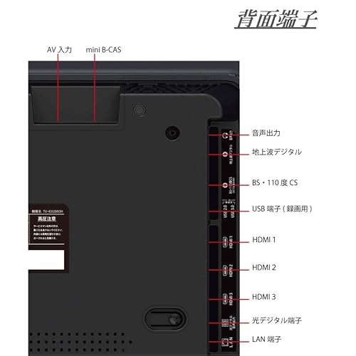 | 付属品 | リモコン、リモコン用単4形電池×2、miniB-CASカード、B-CASカードカバー、カバー固定ネジ×1、スタンド×2、スタンド固定ネジ×4、取扱説明書、電源ケーブル |