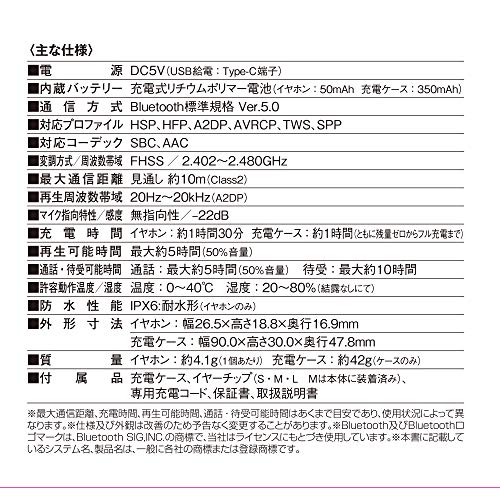 | 付属品 | 充電ケース、専用充電コード、イヤーチップ(S・M・L ※Mは本体に装着済み)、保証書、取扱説明書 |