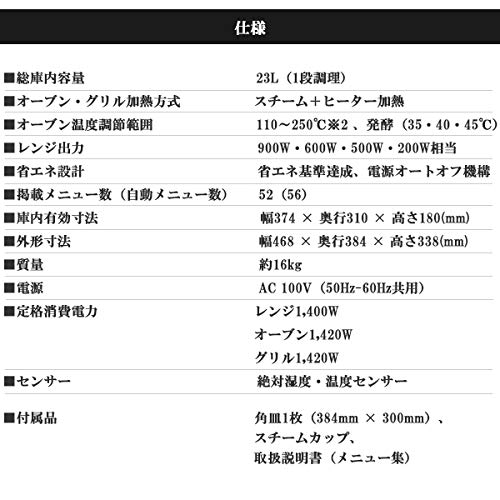 | 付属品 | 角皿1枚(384mm × 300mm)、スチームカップ、取扱説明書(メニュー集付) |