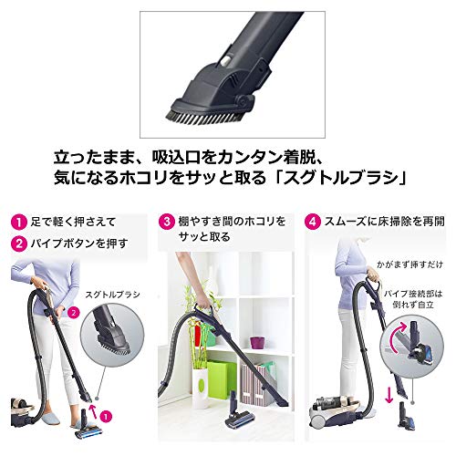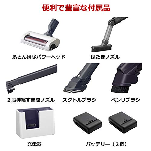 | 付属品 | ふとん掃除パワーヘッド、2段伸縮すき間ノズル、はたきノズル、スグトルブラシ、ベンリブラシ、ホースフック、バッテリー×2個、充電器 |